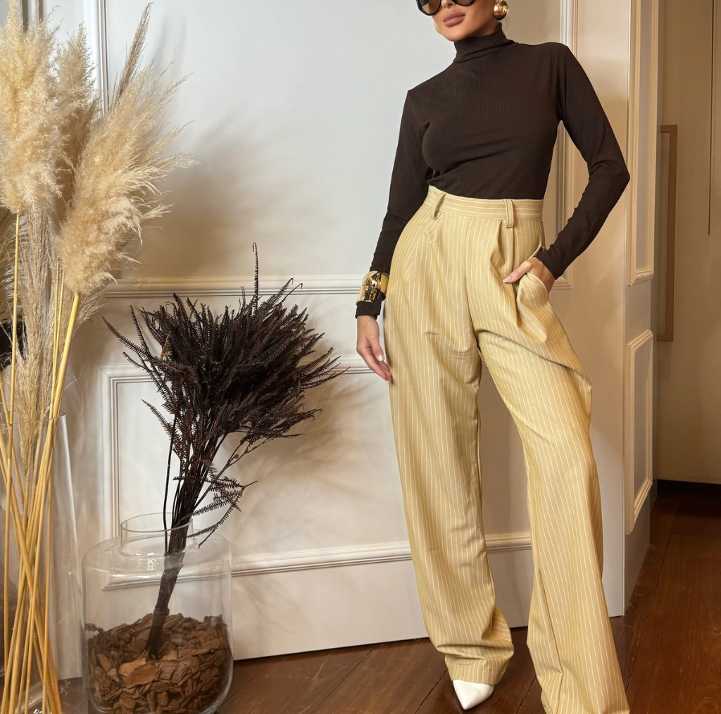 A Calça Gabriela chega em uma nova versão com tecido listrado (83% poliéster, 14% viscose e 3% elastano), que traz leve estrutura, caimento elegante e leve brilho sutil — perfeita para quem ama presença com discrição.